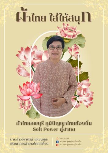สำนักงานพัฒนาชุมชนอำเภอโคกสำโรง จังหวัดลพบุรี ขอเชิญชวนข้าราชการ ภาครัฐ ภาคเอกชน และพี่น้องประชาชนทั่วไป ร่วมสวมใส่ผ้าไทย เพื่อสืบสาน อนุรักษ์ศิลป์ ผ้าถิ่นไทย ดำรงไว้ในแผ่นดิน และรณรงค์ ประชาสัมพันธ์ ส่งเสริม สนับสนุนการใช้และสวมใส่ผ้าไทยในโอกาสตามความเหมาะสม ภายใต้กิจกรรม “ผ้าไทยใส่ให้สนุก” ตามพระดำริสมเด็จพระเจ้าลูกเธอ เจ้าฟ้าสิริวัณณวรี นารีรัตนราชกัญญา และ “ส่งเสริมการใช้ สวมใส่ผ้าไทย เพื่อสร้างรายได้ให้ชุมชน" ตามมติ ครม. เรื่องมาตรการส่งเสริมและสนับสนุนการใช้และสวมใส่ผ้าไทย ตามความเหมาะสมของท้องถิ่น